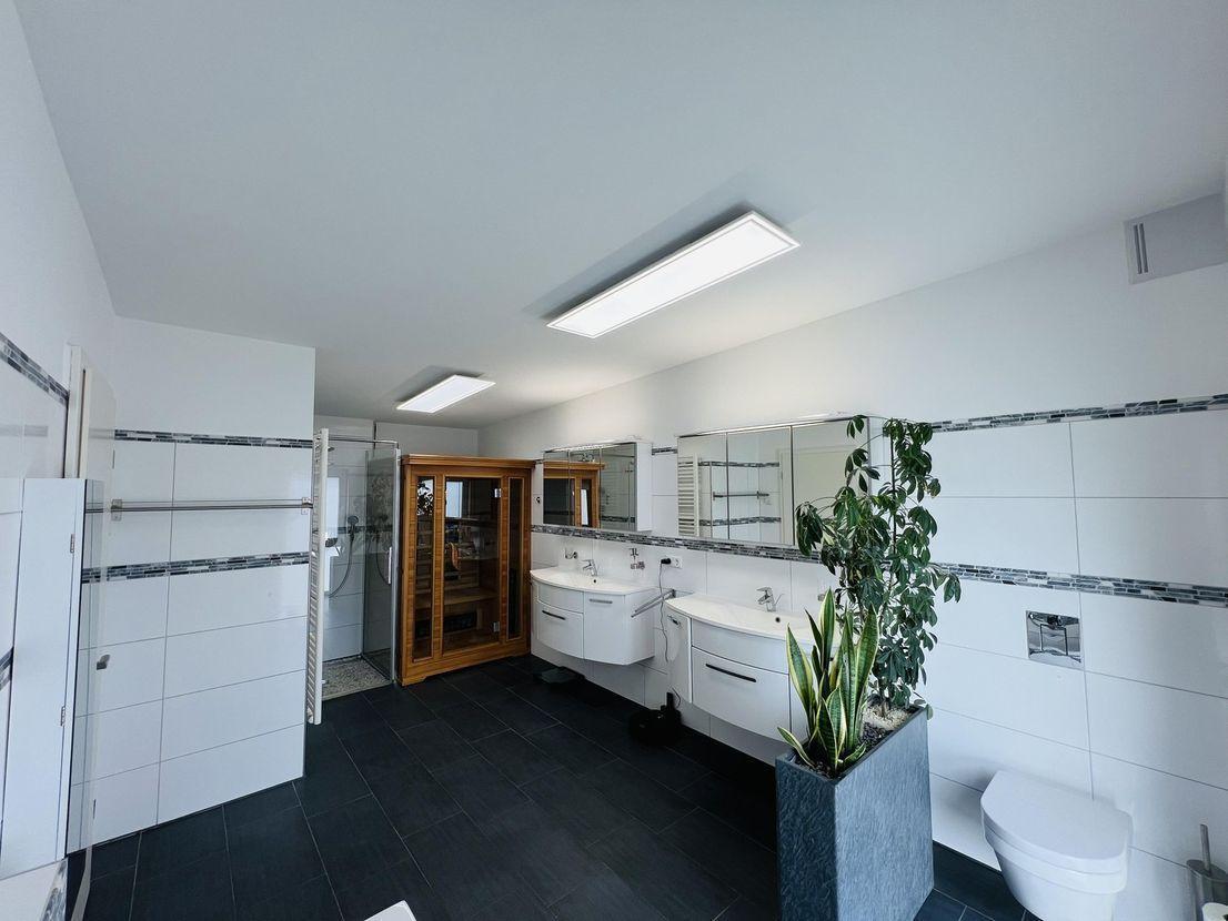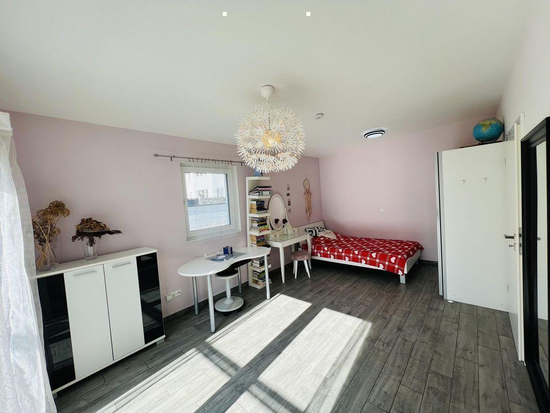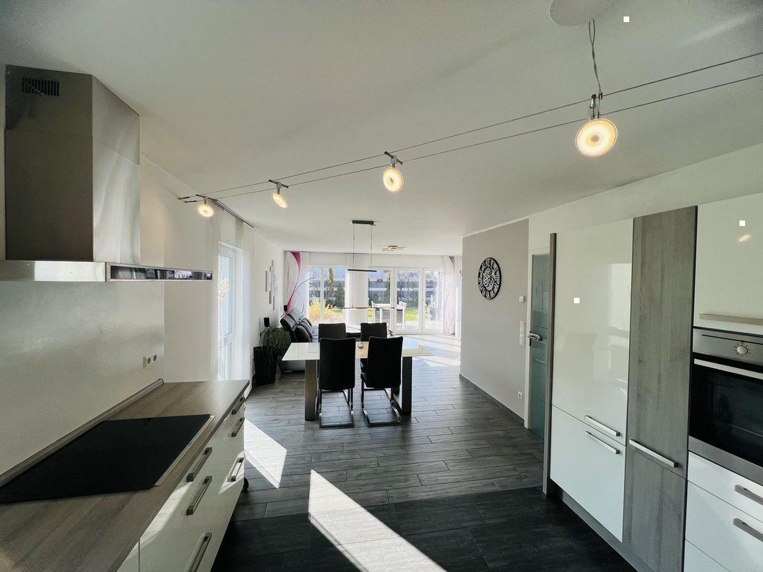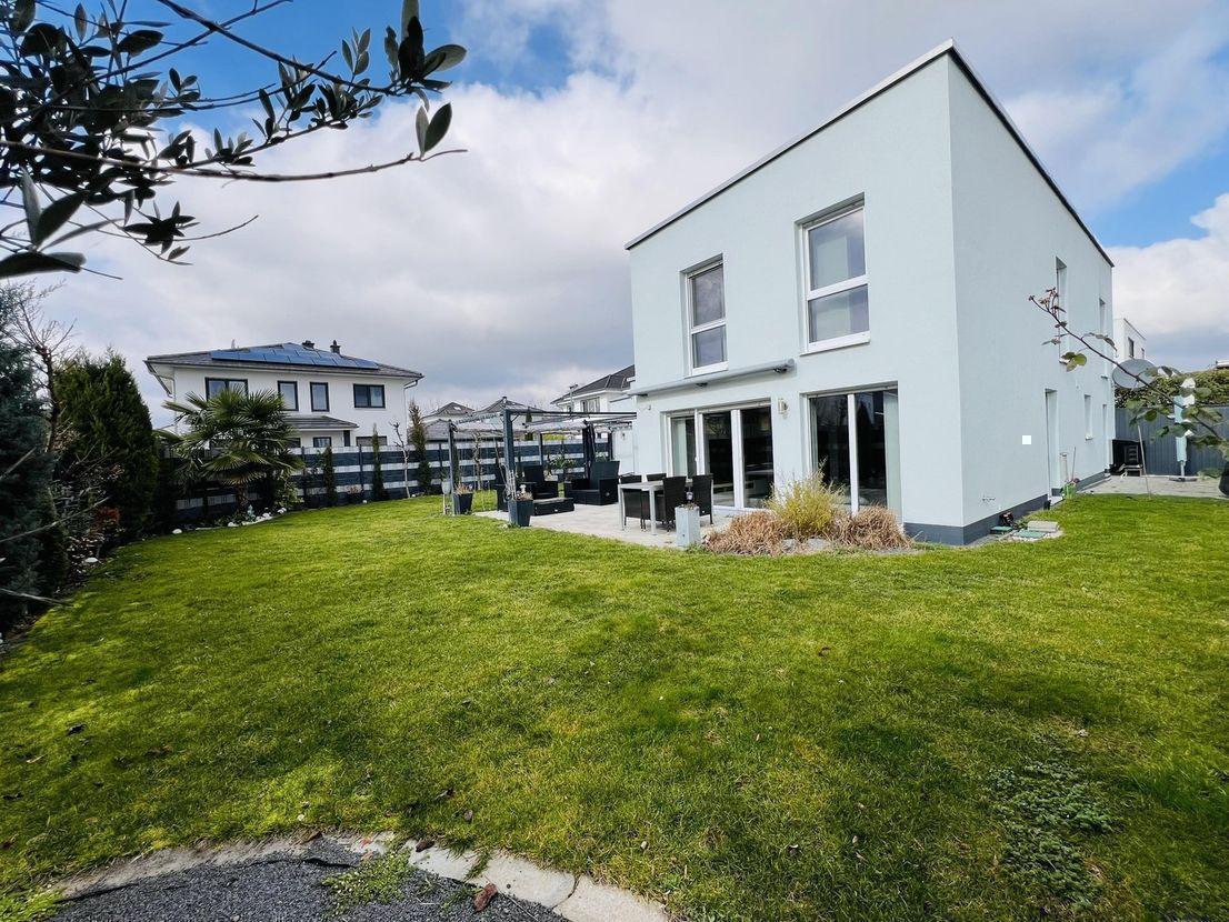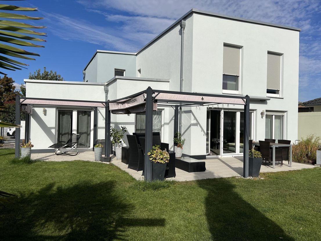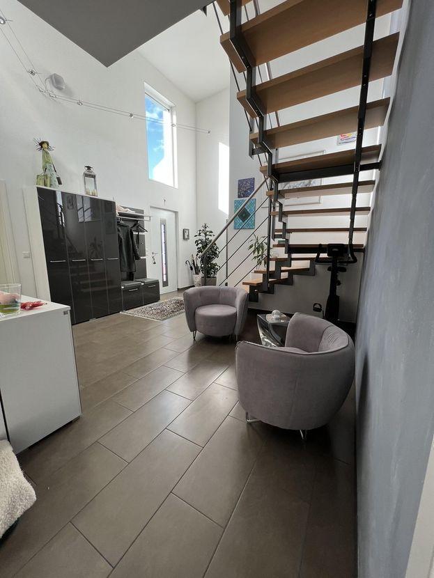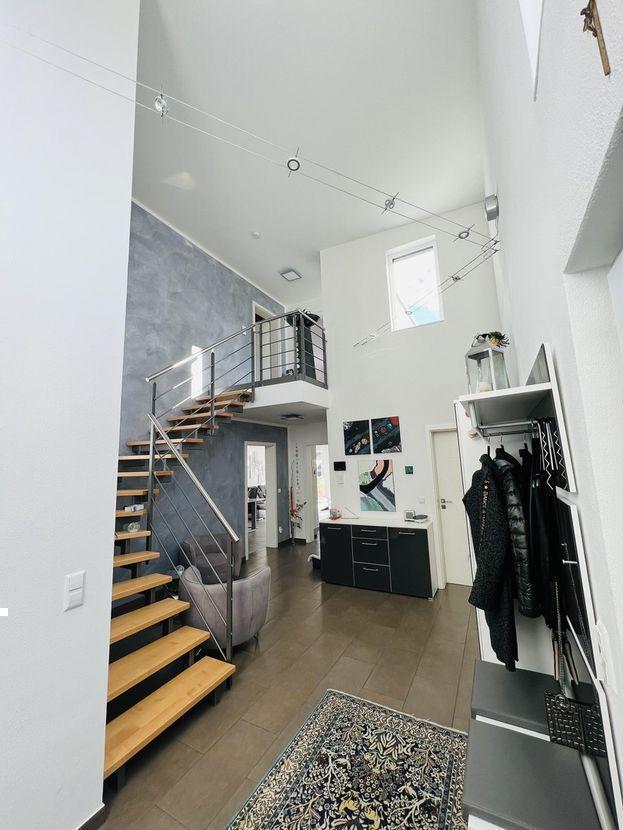 - Ein wunderschönes Architektenhaus in individueller und außergewöhnlicher Bauweise mit gehobener Ausstattung. Entdecke dein neues Zuhause zum Wohlfühlen, sogar mit möglicher Bauerweiterung. Schon bei der Gebäudeplanung wurde hier an alles gedacht, sorgfältig geplant und in hochwertiger Qualität umgesetzt. In deinem neuen lichtdurchfluteten zu Hause erwartet dich ein sehr großzügiger und einladender Eingangsbereich mit Galerie von 5 Meter Deckenhöhe, gleich nebenan lädt das große Wohnzimmer mit offener, moderner Küche und dem individuellen Essbereich zum Wohlfühlen ein, ebenso aus deiner Galerie heraus erreichst du zwei Schlafzimmer mit eigenem modernen und großzügigen Bad mit Steinbodendusche. Über die massive Holztreppe mit Edelstahl/Stahl Konstruktion kommst du ins Obergeschoss zu deiner Indoor Empore und geräumiger Diele, über die du zwei weitere Schlafräume erreichst und ein sehr großzügiges Bad, genieße hier deinen Wellnessbereich im Master Bad mit Infrarot Wärmekabine, Steinbodendusche, zwei grossen Waschbecken und tiefeingebauter Badewanne (im Estrich). Die 3-fach verglasten bodentiefen Sicherheit Fensterelemente von Fa. Schüco im gesamten Haus (auch mit Insektenschutzvorrichtung) inkl. den elektrischen Sicherheit Alu-Fenster Rollläden sorgen für viel Licht, Komfort und Sicherheit. Jeder Raum im EG verfügt über eine eigene private Terrasse mit elektrischer Markise oder mediterranem Alu Gartenpavillon für perfekten Sonnenschutz. Dieses Traumhaus mit Südwest Ausrichtung lässt die Sonnenstrahlen sogar bis spät in den Abend zum Genuss werden sowohl in jedem Raum, auf insgesamt 4 Garten Terrassen (1x Ostterrasse + 3x Südwestterrassen) als auch im grossen, pflegeleichten, wunderschönen, mediterranen und sonnigen Garten zum privaten Luxus Erlebnis werden. Der Garten verfügt darüberhinaus über die autom. Gartenbewässerung und einen Rasenmäher Roboter. Direkt vor der Hauseingangstür befinden sich eine Garage (mit 2 Zugängen vom Hof und Garten) und bis zu 3 PKW Stellplätze. Dein schönes zu Hause in massiver Bauweise mit WDVS, Energieklasse A (Energieausweis liegt vor) alles neuwertig und nach dem aktuellen stand der Technik, kein Renovierungsstau, mit Wärmepumpe und Fußbodenheizung, hochwertige Bodenfließen in Holzoptik, gedämmtes und begrüntes flachgeneigtes Dach (da dringt weder Kälte noch Hitze durch), Vorrichtung für PV-Solaranlage liegt bereits auf dem Dach, großem Hauswirtschaftsraum mit Zugang zu eigener Terrasse und zum Garten.