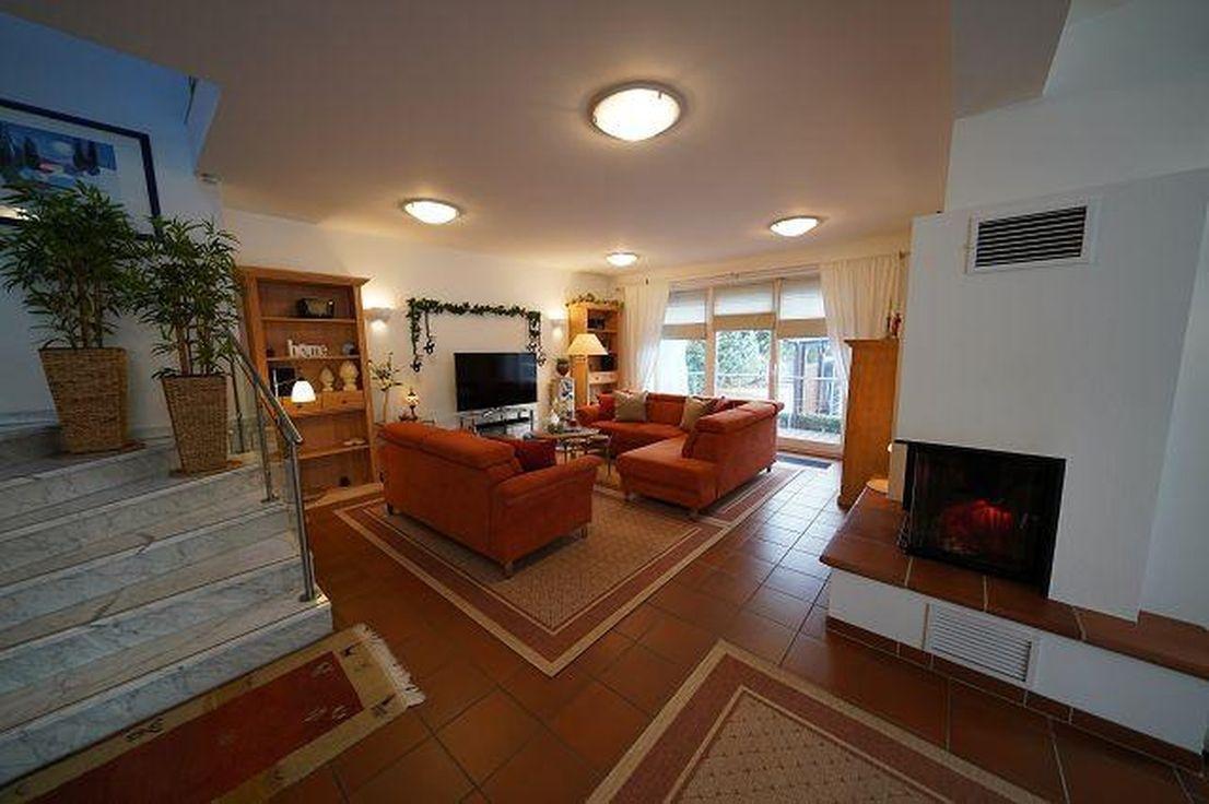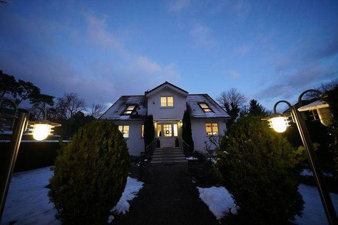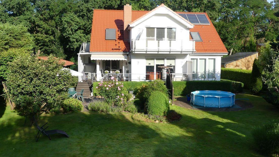 - Das zum Verkauf stehende Einfamilienhaus liegt in einer landschaftlich reizvollen Umgebung. Es wurde im Jahr 1997 errichtet mit einer Wohnfläche von ca. 240 qm incl. ELW. von ca. 70 qm. Das Haus ist voll unterkellert. Die hohen Räume mit ihren großen, bodentiefen Fenstern tragen zu einer luxuriösen Wohnatmosphäre bei. Vom Eingang gelangt man durch eine Doppelglastür in den terracottafarben gefliesten Wohn-und Essbereich mit neuem Eckkamin. Vom Wohnzimmer haben Sie einen direkten Zugang zur windgeschützten, überdachten Terrasse. Große Fenster mit Außenjalousien ermöglichen den Blick auf den liebevoll und pflegeleicht angelegten Garten. Vom Flur und Wohnzimmer gelangen Sie in eine helle Vollholz-/ Einbauküche von Hecker mit Essecke und modernen Markengeräten und Außenabzug. Im Eingangsbereich befindet sich das Gäste WC. Über eine breite Carrara Marmortreppe gelangen Sie ins Obergeschoß. Dort vom Flur gehen 3 Zimmer ab, von denen zwei mit schönen Balkonen versehen sind mit Blick in den Garten. Das Bad mit Badewanne, Dusche, WC rundet diese Etage ab. Vom Erdgeschoß führt eine Treppe in den aus WU-Beton errichteten Souterrainkeller mit Außenzugang. Der Keller hat eine Höhe von 2,60 mtr., ist bestens isoliert, zentralbeheizt und für Wohnzwecke geeignet. Die Beheizung erfolgt über eine Gas-Brennwertheizung, der Warmwasserspeicher (300 ltr.) wird auch über Solarkollektoren beheizt. Eine Alarmanlage mit Telefonaufschaltung ist vorhanden. An der Nordseite des Hauses befindet sich die ca. 70 qm große Einliegerwohnung. Sie hat ebenfalls bodentiefe Fenster und ist mit einer kompletten Küche ausgestattet. Vom Eingang gelangen Sie über einen Flur zum Gäste-WC und Wohnzimmer, das eine Treppe zum Garten hat. Im Wohnzimmer führt eine breite Wendeltreppe in das Souterrain mit dem Schlafzimmer und anschließendem Bad mit Wanne, Dusche, WC, Waschbecken. Das 1655 qm große , sonnige Grundstück ist eine wahre Rarität in Berlin, es ist parkähnlich und pflegeleicht gestaltet. Die Doppelgarage für 2 PKW ist mit einem Hörmanntor ausgestattet und hat viel Platz für Kaminholz usw. Es gibt 3 Gartenhäuschen. Vorhanden ist eine Regenwasserzisterne für ca. 20000 ltr. und ein Tiefbrunnen. Beides wird automatisch betrieben.