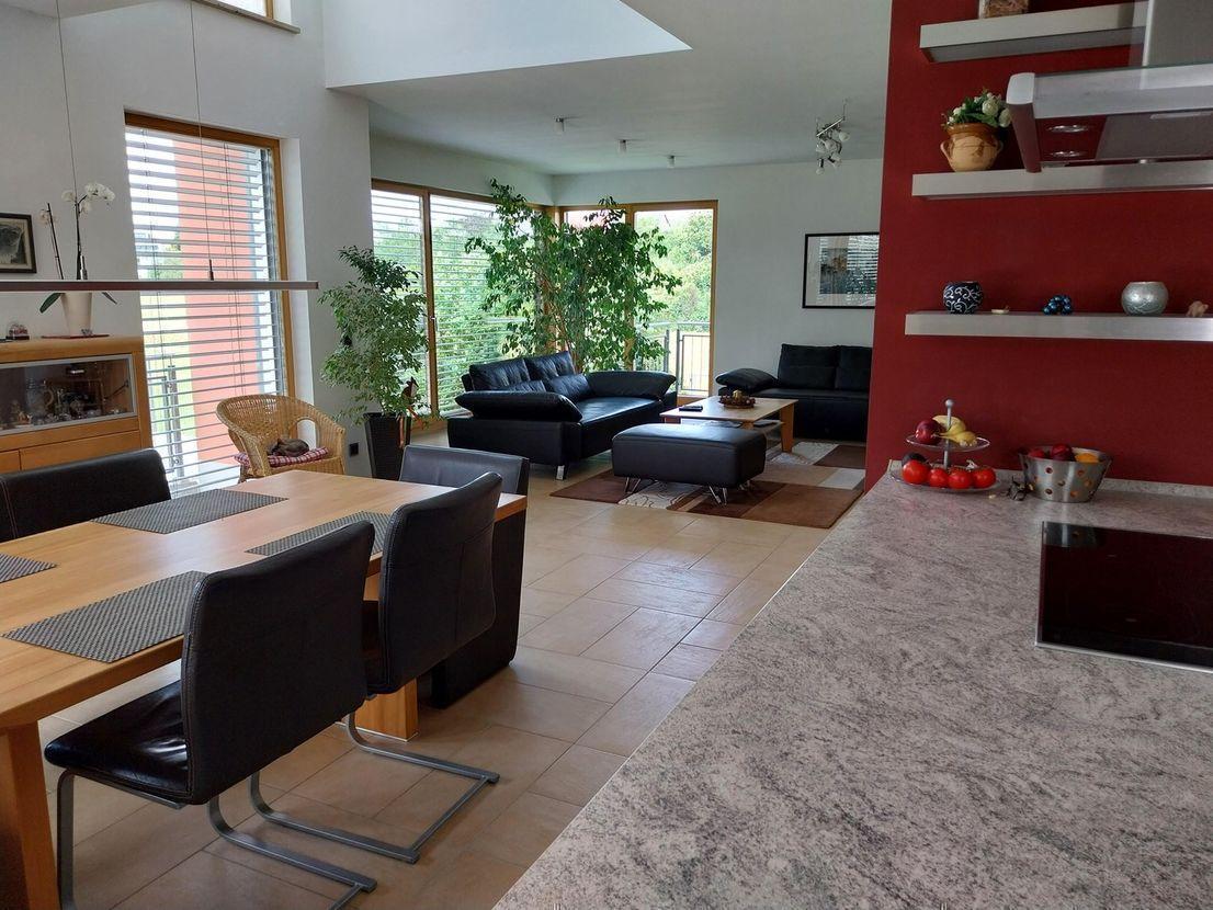 - Am Ende einer ruhigen Spiel- und Stichstraße im beliebten Berggebiet bietet dieses exklusive Architektenhaus aus dem Jahr 2009 eine unvergleichliche Kombination aus Komfort, Energieeffizienz (KfW 40) und perfekter Lage. Bezugsbereit nach Absprache besticht es durch seinen neuwertigen Zustand, die exzellente Anbindung und die hochwertige Ausstattung. Mit viel Platz, einer durchdachten Raumaufteilung und einer liebevoll gestalteten Außenanlage eröffnet es neue Lebensqualität für anspruchsvolle Familien, auch als Mehrgenerationenhaus oder Wohnen und Arbeiten und bietet sofortigen Wohnkomfort ohne anstehende Renovierungen. Ihre Fahrzeuge finden Platz in der übergroßen Doppelgarage mit elektrischen Toren und direktem Zugang zum Haus, sowie auf den 2 Stellplätzen. Mit einer großzügigen Wohnfläche von 280 m² erfüllt dieses Objekt die höchsten Ansprüche. Die Einliegerwohnung im Untergeschoss mit eigenem Eingang ist ideal für Gäste, Familienmitglieder, zur Ausübung einer selbstständigen Tätigkeit oder als rentable Vermietung. Die moderne Erdwärmepumpe in Kombination mit einer Fußbodenheizung sorgt für wohlige Wärme im gesamten Haus. Im gesamten Haus sind elektr. Rollläden, im Wohn-/Essbereich und Küche sind elektr. Raffstore, alle sind auch über das BUS System steuerbar. Im Erdgeschoss (114 m²) erwartet Sie eine großzügige Diele mit modernem Einbauschrank für Schuhe und Jacken, Gäste-WC, sowie ein Abstellraum, der auch von der Garage aus zu betreten ist. Die offene Küche mit Kochinsel und der Wohn-/Essbereich sind lichtdurchflutet. Die Südwest-Terrasse ist durch mehrere Hebeschiebetüren vom Wohn-/Essbereich betretbar. Auf dieser Etage befindet sich zudem ein großes Zimmer mit einem Balkon und Zugang zum Garten. Der Garten bietet einen unverbaubaren Weitblick. Im Obergeschoss gibt es auf einer Wohnfläche von ca. 94,5 m² ein Tageslichtbad mit Badewanne und Dusche sowie 2 bis 3 weitere Räume, die als Wohn- oder Schlafraum genutzt werden können. Zwei Räume haben jeweils einen Balkon. Des Weiteren ist noch ein Abstellraum mit Waschmaschinenanschluss vorhanden, sowie eine Galerie. Das Obergeschoss hat keine Dachschrägen. Im Dachgeschoss befindet sich mit ca. 15 m² ein als Büro oder Hobbyraum nutzbarer Spitzboden. Das Untergeschoss bietet eine Einliegerwohnung mit ca. 64 m² zzgl. Terrasse und separatem Zugang von außen. Zusätzlich sind auf dieser Ebene noch rund 50 m² Nutzfläche vorhanden. Die 3 Geschosse sind durch die extra breite Podesttreppe miteinander verbunden. Das Treppenhaus ist Tageslicht durchflutet. Bei Dunkelheit sorgen im Treppenhaus, in den Dielen und im Außenbereich die durch das BUS System gesteuerte LEDs für Sicherheit und Komfort.